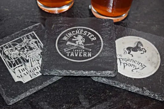 Slaughtered Lamb, Prancing Pony, Winchester Pub, and Green Dragon Inn Slate Coasters Set of 4