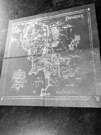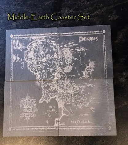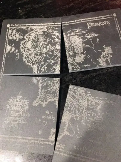 Map of Middle Earth laser engraved on a set of slate coasters, Perfect for parties and impressing all your LOTR fan friends. These black slate coasters are perfect for indoor or outdoor use and dishwasher safe.