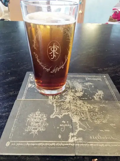 One set includes 4 laser etched coasters together making up the map of Middle Earth.