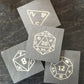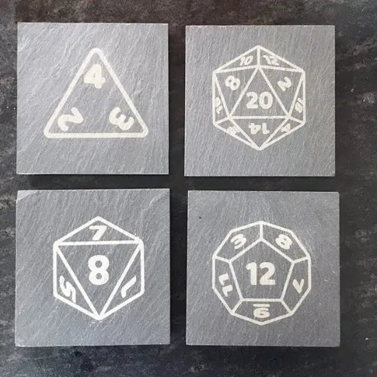 These Dungeons and Dragons Dice Coasters are perfect for Dungeons and Dragons sessions. Decorated with the six-sides, eight-sided, 20 sided dice, and more these black slate coasters will be a favorite for players and DM alike. Durable and dishwasher safe with non-slip bottoms.