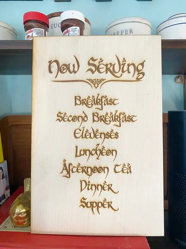 Hobbit Now Serving Elevensies Wall Sign, woodwork pyrography
