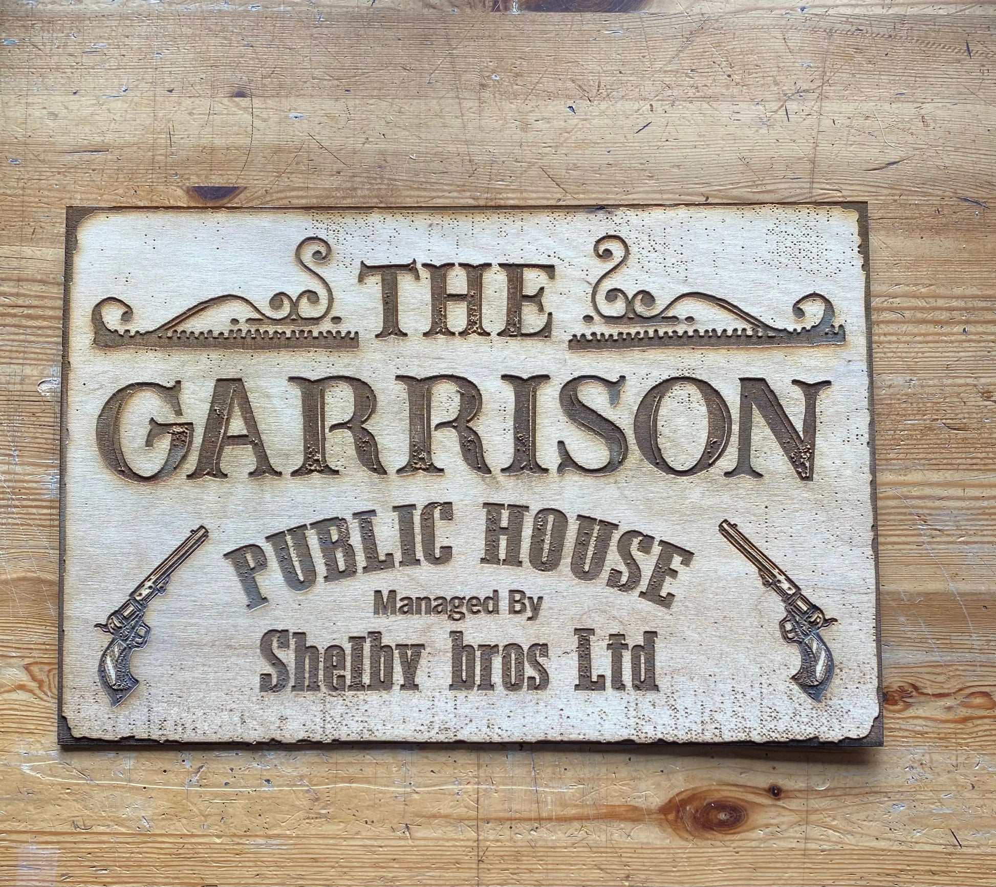 If you're a fan of Peak Blinders, you know that The Garrison Pub, owned by the Shelby Brothers, features on the show as the Peak Blinders favorite hangout. Now you can have the iconic pub sign over your very own bar to know by whose orders you remain open.