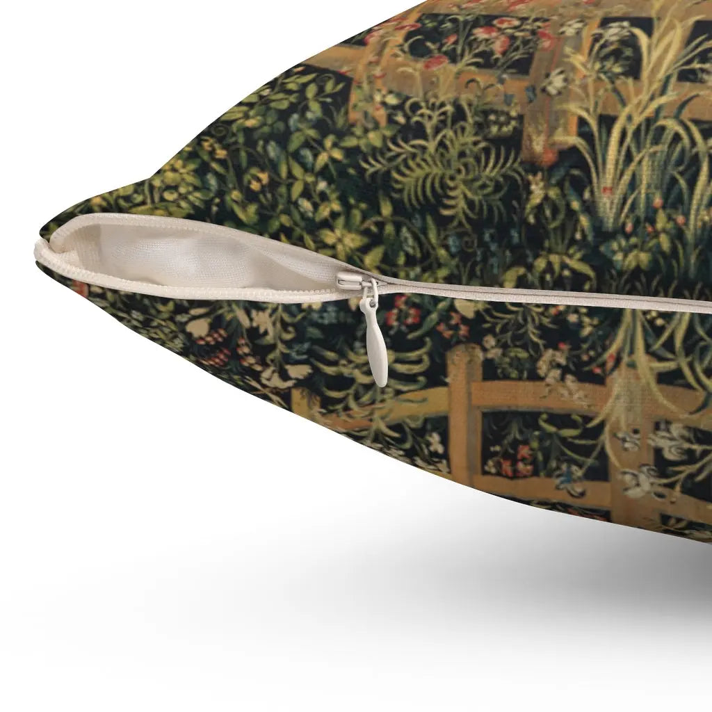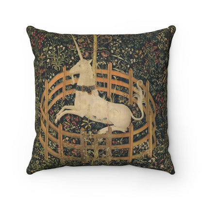 This beautiful pillow features one of five medieval unicorn tapestries featured in New York Cloisters Museum. Part of one of the most famous sets of unicorn art in the world, this pillow is sure to add elegance and charm to any room. These beautiful indoor pillows in various sizes serve as statement pieces, creating a personalized environment. .: Double sided print .: Concealed zipper