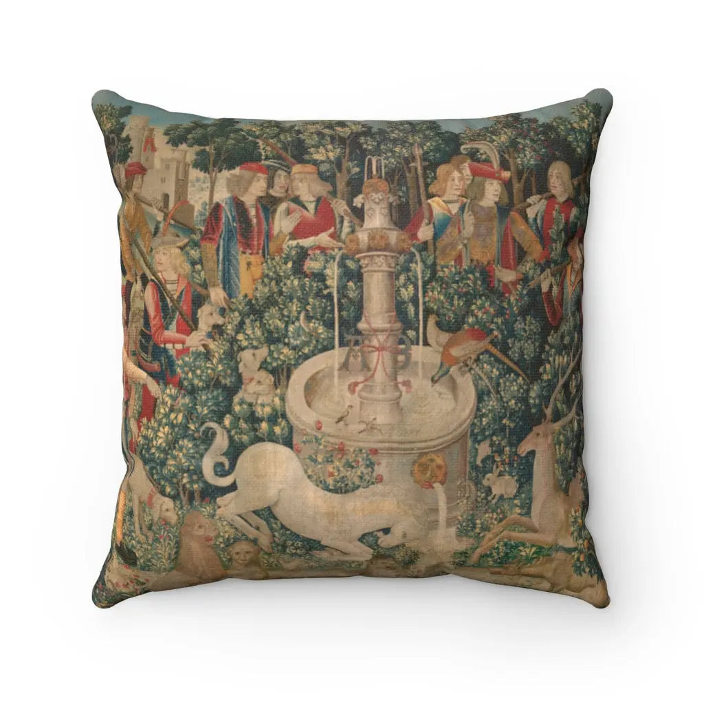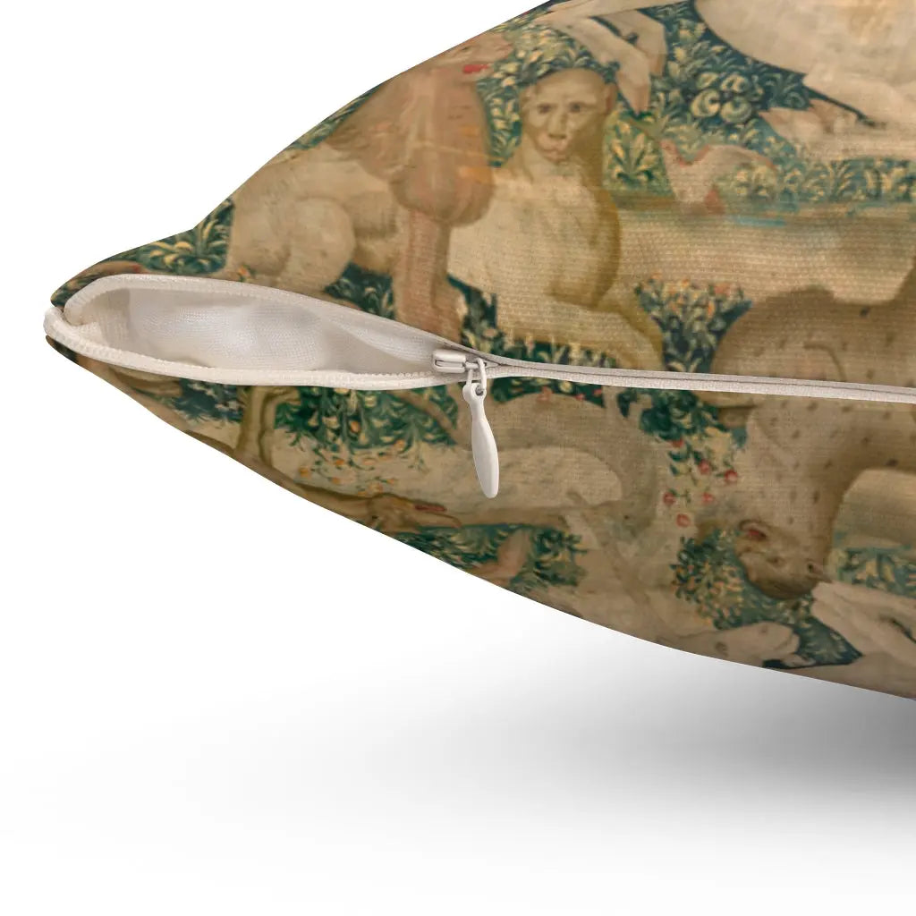 This beautiful pillow features one of five medieval unicorn tapestries featured in New York Cloisters Museum. Part of one of the most famous sets of unicorn art in the world, this pillow is sure to add elegance and charm to any room. These beautiful indoor pillows in various sizes serve as statement pieces, creating a personalized environment. .: Double sided print .: Concealed zipper