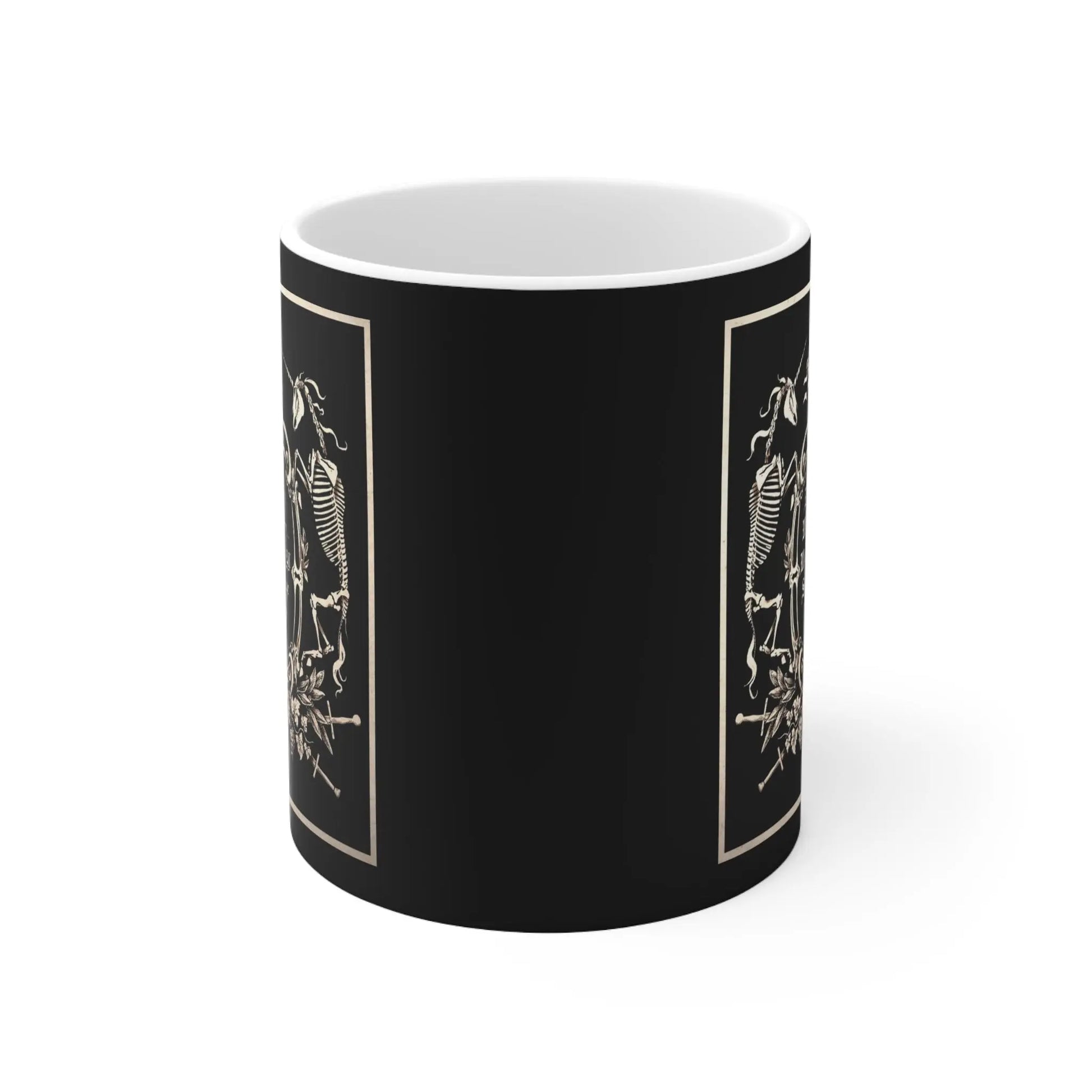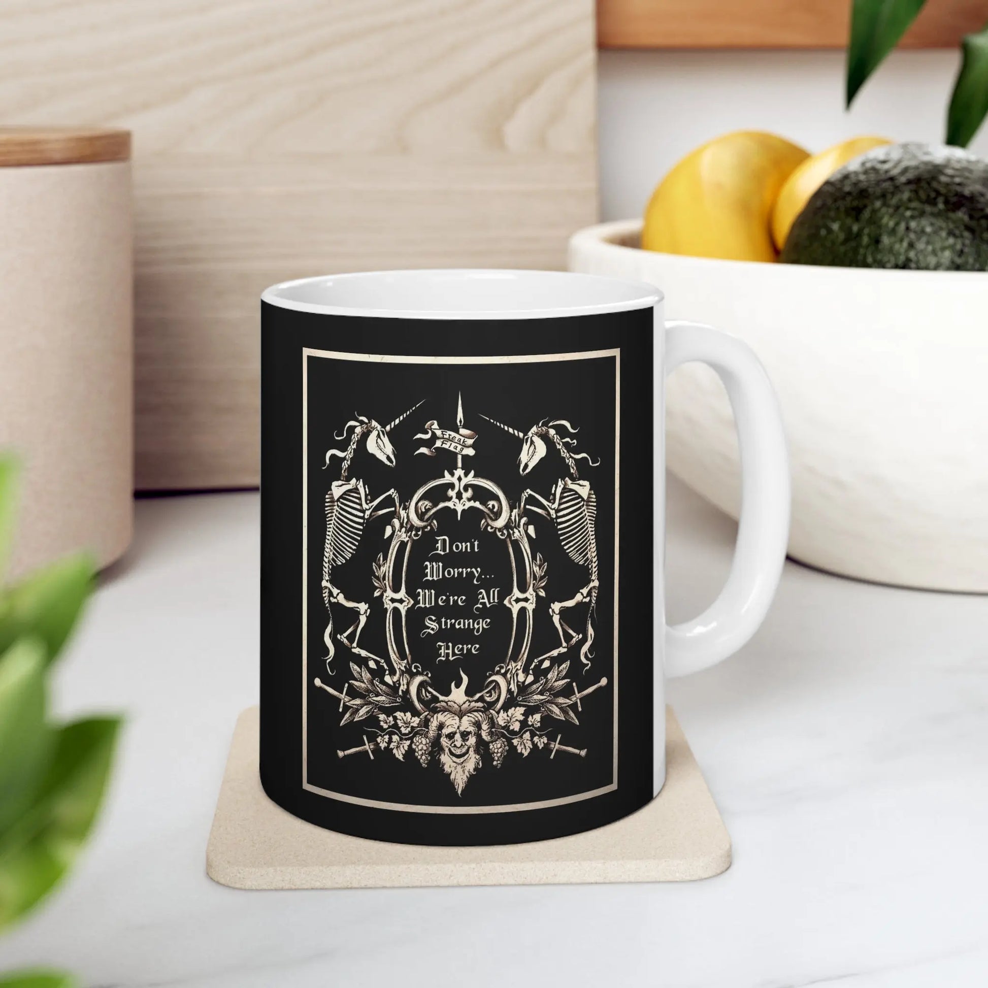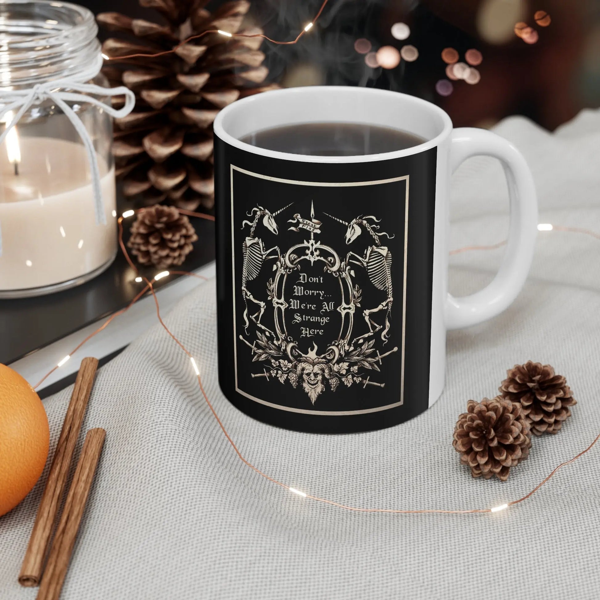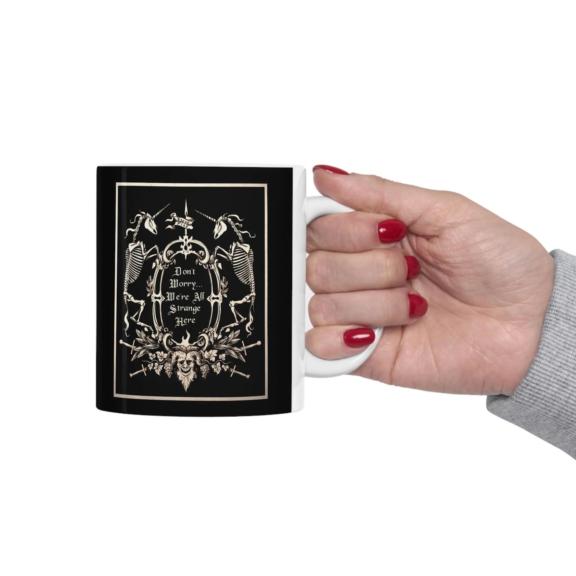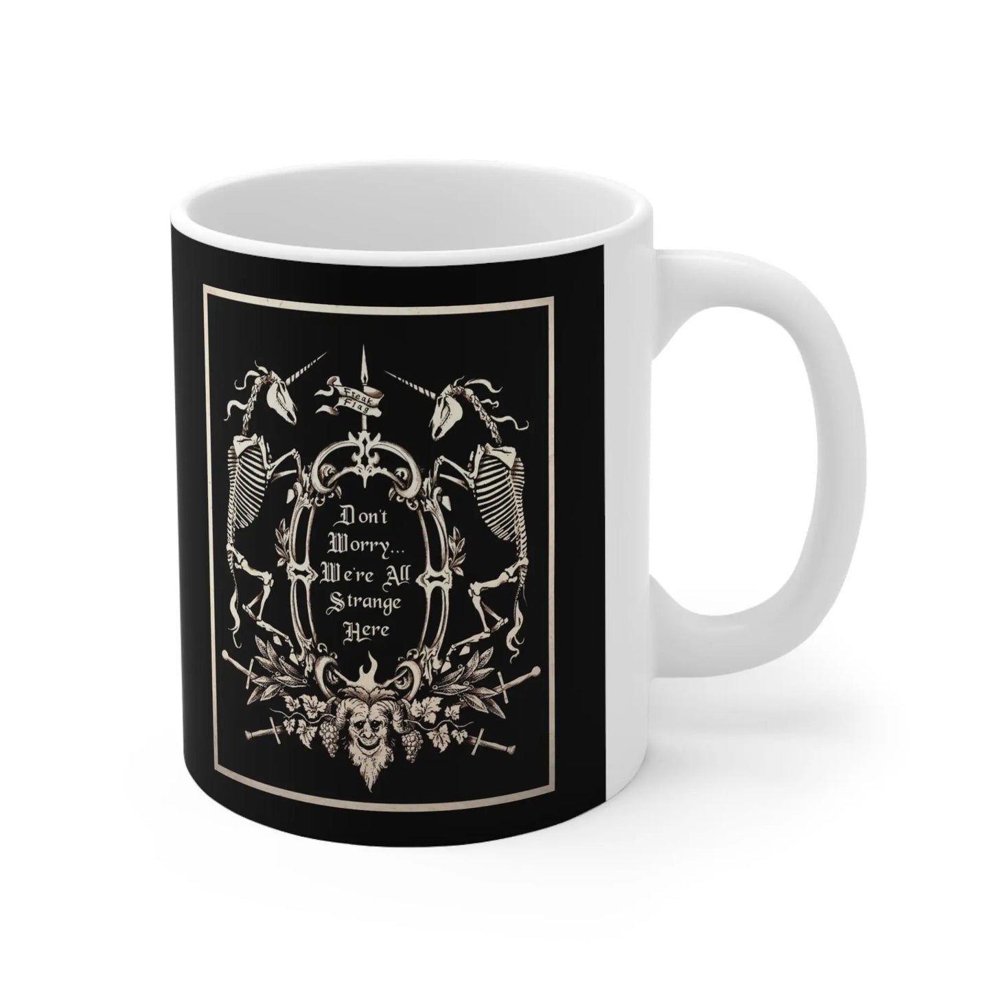 This 11oz We’re All Strange Here Goth mug features an Emily Strange quote, a skull and bird bones graphic, and a black gothic design. Perfect for any fan of emo or goth, this mug is sure to brighten up your day. A perfect Memento Mori gift!